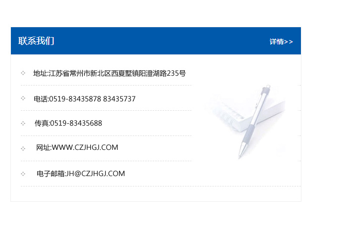 地址:常州市新北區友邦商務大廈1幢16、17層  電話:0519-85101652  傳真:0519-85112595  郵編:213022  網址:www.cz-jiayue_cn.ew027.com  郵箱:xiajifengaa@163.com